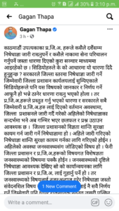 कर्मचारीको काँधमा बन्दुक राखेर निषेधाज्ञाको गोली मात्रै जनतातर्फ नबर्साउनुहोस् । यस्तै चलिरहने हो भने,नागरिकले सरकारको कुरा सुन्न छाड्नेछन् । कोरोनाको अहिलेको अवस्थामा नागरिकले सरकारको कुरा सुन्न छाडे भने देश ठूलो संकटमा फस्नेछ । देशलाई जानी जानी त्यस्तो संकटतर्फ नधकलौं । सरकारको अकर्मण्यता र गैर जिम्मेवारी प्रवृत्तीबाट कुनै संकट उत्पन्न नहोस् भन्ने चाहना सबैको हो । सरकार र राजनीतिक नेतृत्वमा जिम्मेवारी बोध र ईमानदारिता हुने हो भने अझै बिग्रेको छैन उहाले अफ्नो पेज मार्फत सर्वजानिक गर्नुभएको छ ।