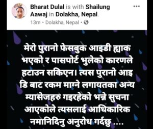 दोलखाको शैलुङ् गाउपालिका प्रमुख भरत प्रसाद दुलाल को फेसबुक एकाउन्ट बाट बिबिध व्यक्ति लाई पैसा माग्ने क्रियाकलाप भएपछी ब्यापक गुनासो आएको छ। गाउपालिका प्रमुख दुलालको फेसबुक आइडी बाट फेसबुकमा रहेका विभिन्न साथी हरुलाइ रकम माग गरि रहेको र विभिन्न ब्यतिलाइ गलत म्यासेज पठाइरहेको पाइएको छ । समस्या परेको भन्दै विभिन्न ब्यतीक बैक खातामा पैसा हालिदिन म्यासेज गरि रहेको पाइएको छ ।