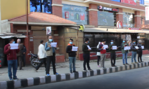 कात्तिक २५,काठमान्डौ । आज(मंगलवार) कात्तिक २५ गते बिहान ८:३० बजे माईतिघर मण्डलामा नेपाल सुशासन अभियान ले सर्वोच्चको आदेश तुरुन्त कार्यान्वयन गर्न , कोरोनाको निशुल्क उपचार गर्न , भ्रष्टाचारको छानविन गर्न , उंखु किसानको भुक्तानी गर्न र कोरोना महामारी रोकथाममा प्रभावकारी काम गर्न आग्रह गर्दै करिब आधा घण्टा उभिएर सरकारलाई दबाव दिदै सरकारविरुद्ध प्रदर्शन गरेको छ।