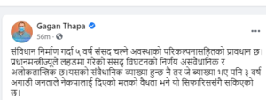 उहाले सामाजिक संजालमा लेख्दै संविधान निर्माण गर्दा ५ वर्ष संसद चल्ने अवस्थाको परिकल्पनासहितको प्रावधान छ। प्रधानमन्त्रीज्यूले लहडमा गरेको संसद् विघटनको निर्णय असंवैधानिक र अलोकतान्त्रिक छ।यसको संवैधानिक व्याख्या हुन्छ नै तर जे ब्याख्या भए पनि ३ वर्ष अगाडी जनताले नेकपालाई दिएको मतको वैधता भने यो सिफारिससंगै सकिएको छ।